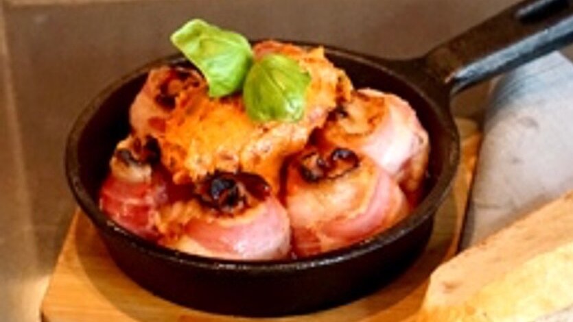 - Jede Jakobsmuschel mit einer Scheibe Bacon umwickeln.