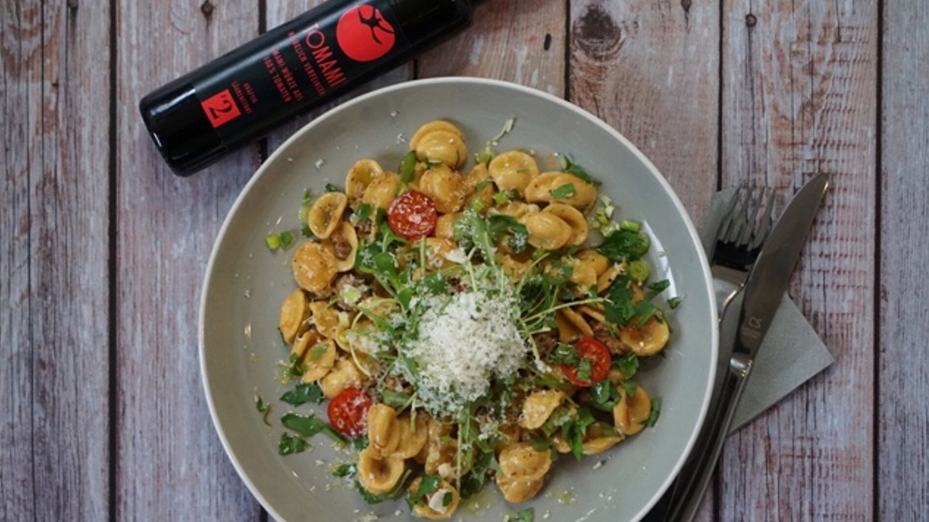 - Pasta auf Tellern anrichten, mit Rucola garnieren und geriebenen Parmesan darüberstreuen.
