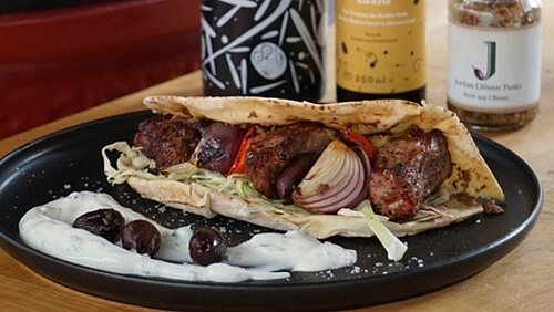 Jordan | Griechische Fleischspieße mit Honig-Joghurt im Kichererbsen-Fladen